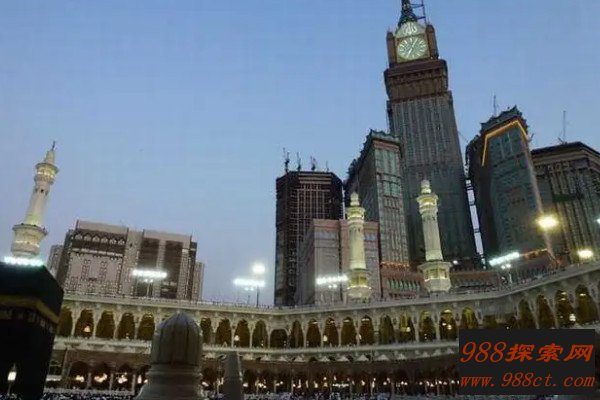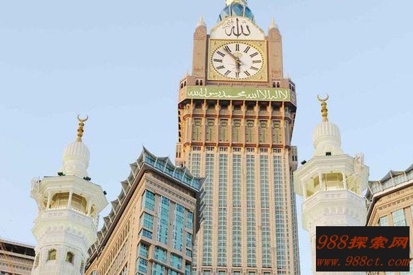 皇家钟塔酒店的顶部四面都是钟表,而且每个钟的表盘直径有40米。如果仔细观察,会发现这栋大楼的顶端还有一轮弯月,这轮弯月是沙特送入云霄的地标性符号,光是这个设计就花费了8亿美元,据说这个钟塔的主要目的,是当作朝圣时标准时间校对之用。