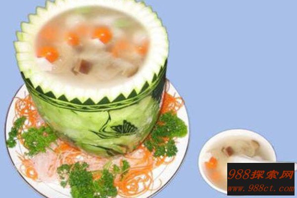 什锦冬瓜帽是广东一道传统名菜,它属于粤菜系,以冬瓜和猪肉为主要原料制作而成,它适合脾胃虚寒、阳气不足的人群食用,制作时以老熟的冬瓜为最佳食材。