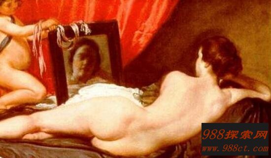 这幅《镜前的维纳斯》是由西班牙画家在1651年创作的,画中的主角是古希腊神话中的维纳斯与丘比特两人,他们都是裸体状态,丘比特拿起一面镜子,维纳斯在欣赏自己的脸庞,据说这幅画让很多博物馆的人都发疯了。