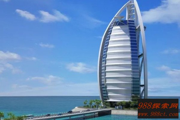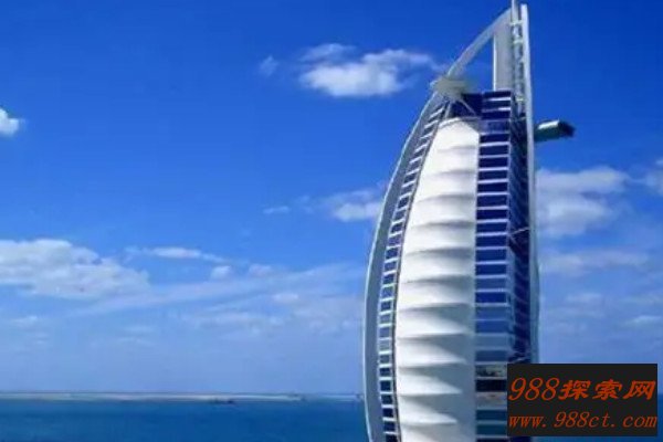 迪拜帆船酒店的高度为321米,一共有56层,建在离沙滩岸边280米远的波斯湾内人工岛上,顶部设有一个停机坪。据说在迪拜种植一棵树就要花费3000美元以上,其中有多个世界上最贵的酒店,奔驰在这里当警车用,金银首饰是每个女人的必备品,还有全球最贵族化的运动。