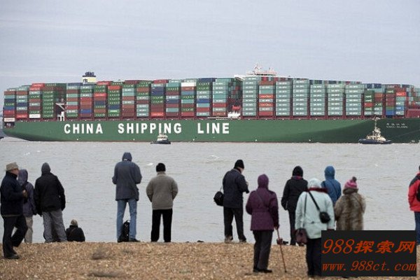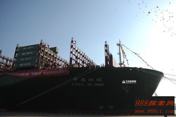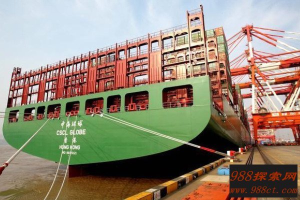 中海环球号货轮是2014年度世界上最大、最先进的集装箱船,同时也是中国海运集团订制的5艘19100 TEU型集装箱船中的首条船,该船全长400米,宽度约为60米,整个船体的大小超过4个标准足球场,船身的长度比美国海军“尼米兹”号航空母舰还要多出67米,堪称“海上巨物”。