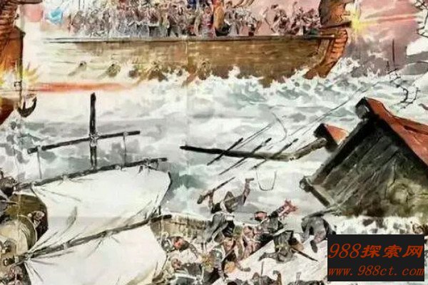 后来两军激战数日,宋军损失惨重,并未打破元军的封锁。元军就找准时机从四个方向发起突袭,他们用帆布遮蔽船只,在大雾天气的掩护下出现在宋军前面,宋军无力抵抗,阵脚大乱。陆秀夫看见宋军无法突破,就背着赵昺投海自尽。《宋史》中记载,七天后海上有十多万具尸体浮起。