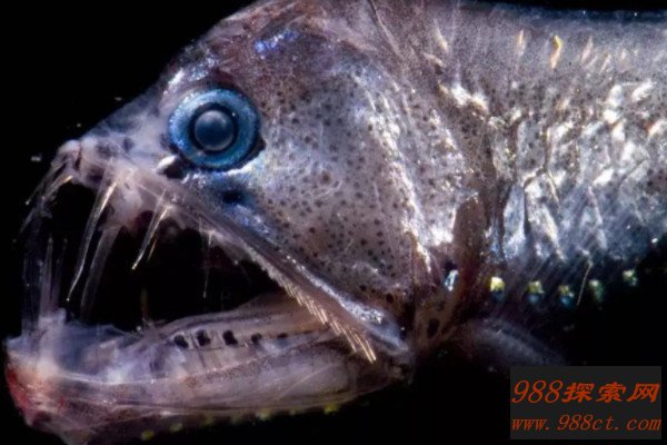 毒蛇鱼主要分布在全球的热带至温带海域,它们因为具有像毒蛇一样的毒牙而得名,身上分布有很多发光器,常常利用发光器诱捕食物,能一口吞下比自己大很多的猎物,这种鱼还有大大的圆眼睛,看上去就像恶魔一样。