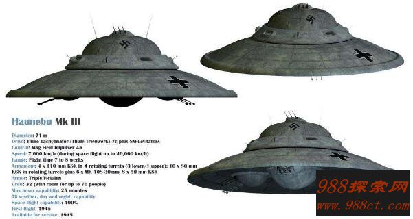 从此,UFO或飞碟的大名日益为世人所熟知。英、美两国各自立即成立了秘密的调查小组,而等到二战结束,人们才发现早在1940年末,德国就成立了一个名为“爆破手研究室—13”的秘密机构,其任务是专门研究、制造秘密飞行器。其活动代号为“乌兰努斯行动”。